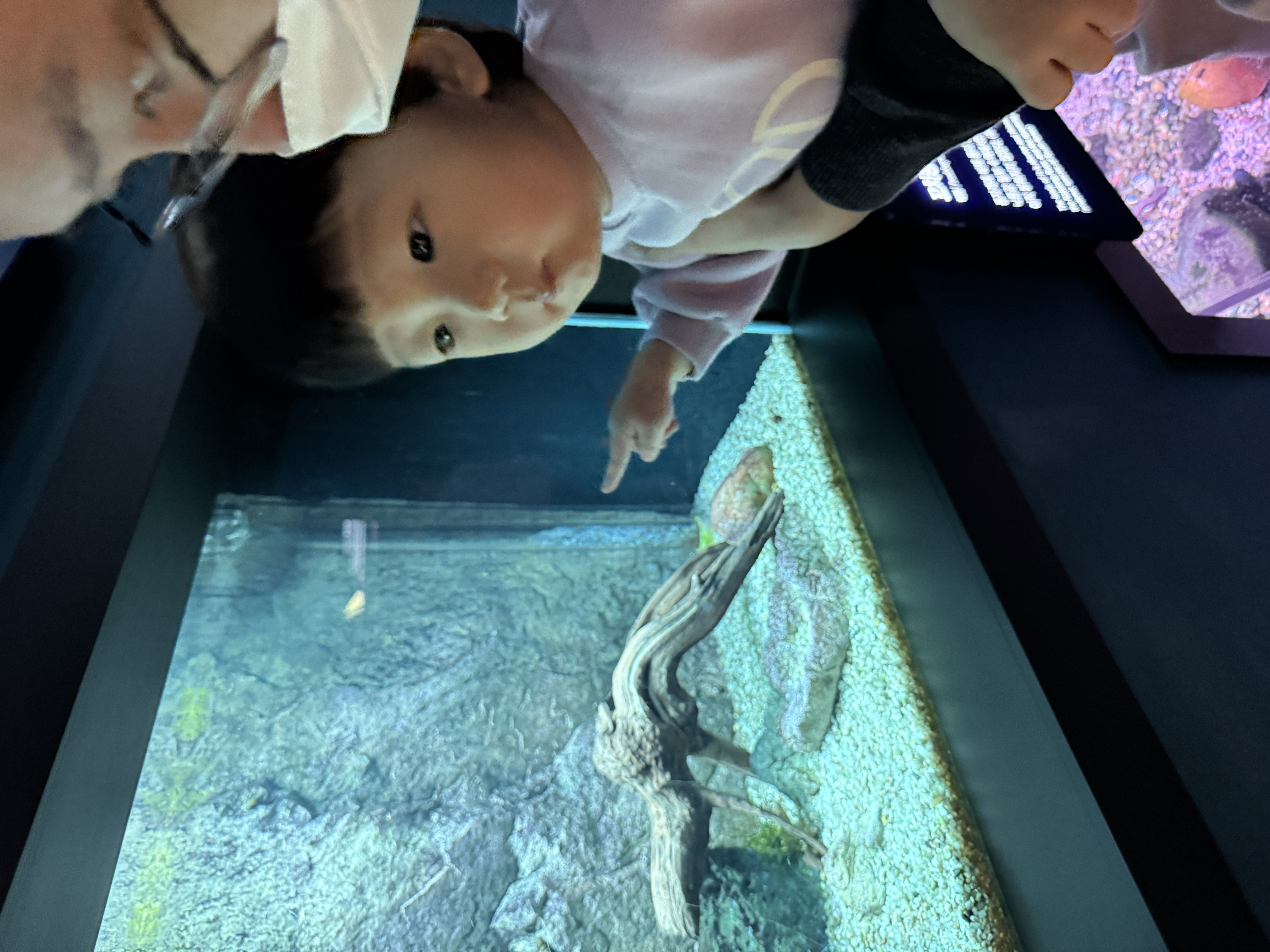 3살 아기가 한참을 찾더니 드디어 발견하고 손가락으로 숨어있던 감돌고기를 가리켰어요!